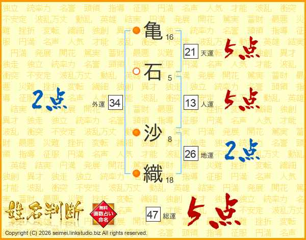 亀(16画)石(5画) 沙(8画)織(18画)