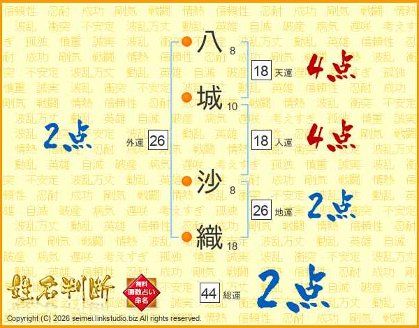 八(8画)城(10画) 沙(8画)織(18画)