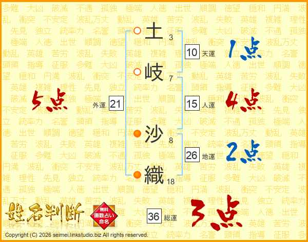 土(3画)岐(7画) 沙(8画)織(18画)
