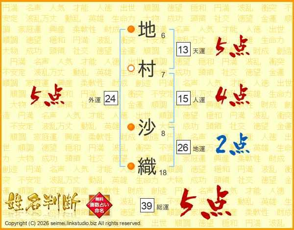 地(6画)村(7画) 沙(8画)織(18画)