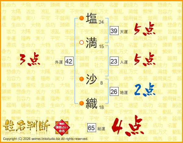 塩(24画)満(15画) 沙(8画)織(18画)