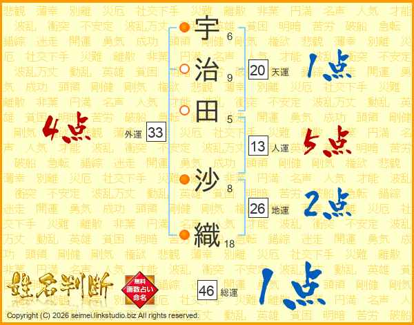 宇(6画)治(9画)田(5画) 沙(8画)織(18画)