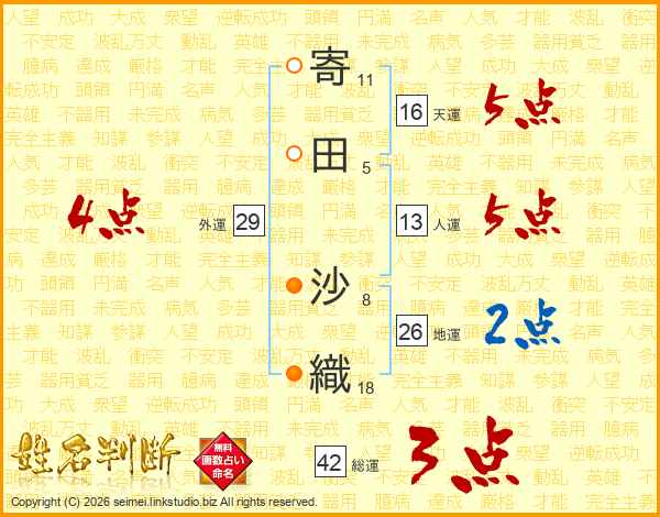 生活面を象徴する運勢です。外部から受ける影響力を表し、結婚運、家庭運や職場、環境への順応性を表します。総運から人運を引いた画数。姓や名が1文字の場合を除く。