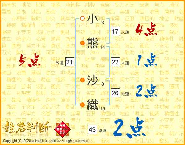 生活面を象徴する運勢です。外部から受ける影響力を表し、結婚運、家庭運や職場、環境への順応性を表します。総運から人運を引いた画数。姓や名が1文字の場合を除く。