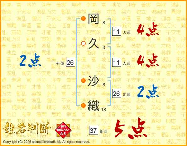 岡(8画)久(3画) 沙(8画)織(18画)