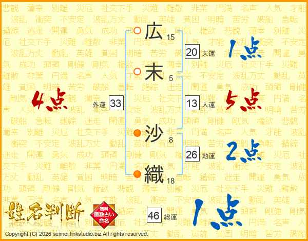 広(15画)末(5画) 沙(8画)織(18画)