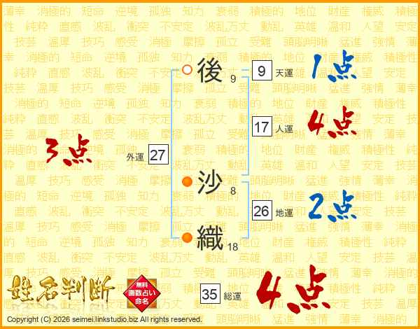後(9画) 沙(8画)織(18画)