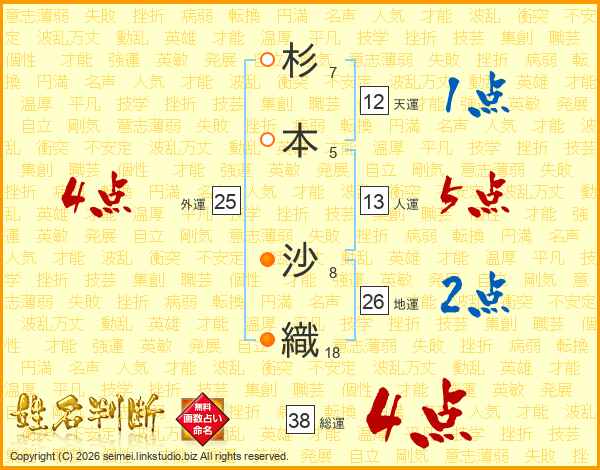 杉(7画)本(5画) 沙(8画)織(18画)