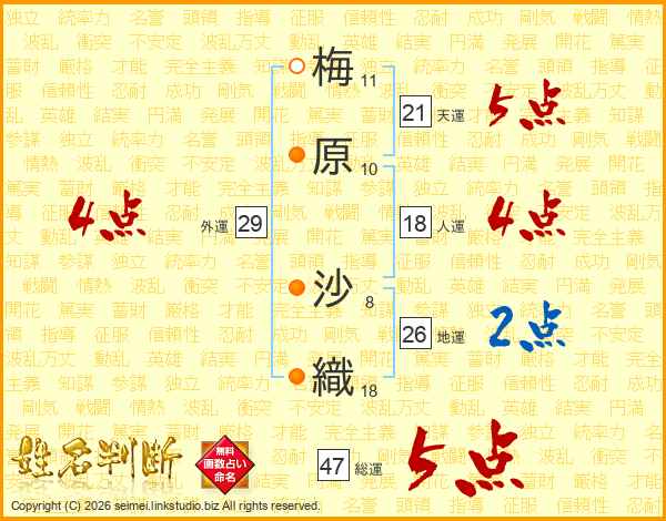 生活面を象徴する運勢です。外部から受ける影響力を表し、結婚運、家庭運や職場、環境への順応性を表します。総運から人運を引いた画数。姓や名が1文字の場合を除く。