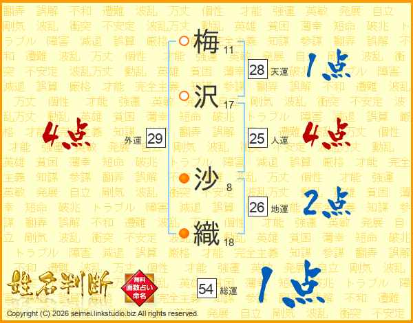 梅(11画)沢(17画) 沙(8画)織(18画)