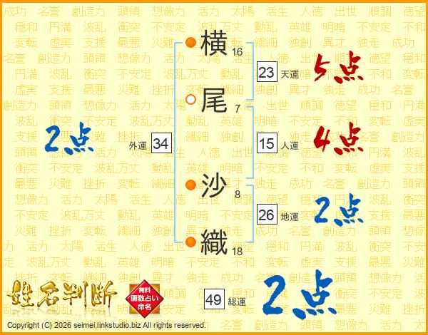 横(16画)尾(7画) 沙(8画)織(18画)
