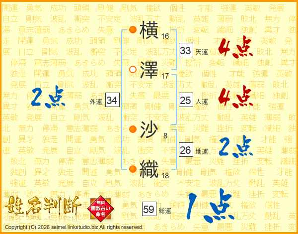 横(16画)澤(17画) 沙(8画)織(18画)