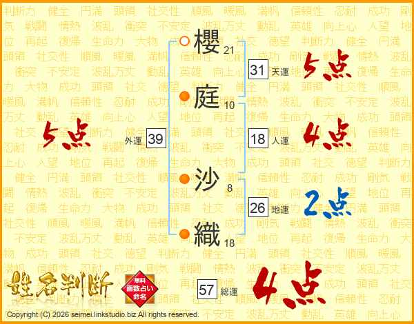 櫻(21画)庭(10画) 沙(8画)織(18画)