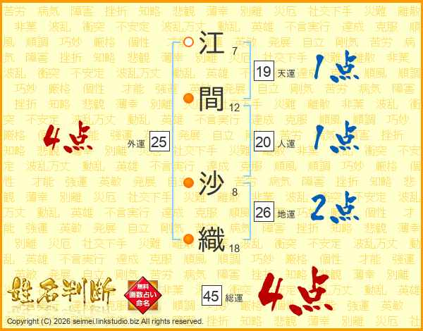 生活面を象徴する運勢です。外部から受ける影響力を表し、結婚運、家庭運や職場、環境への順応性を表します。総運から人運を引いた画数。姓や名が1文字の場合を除く。