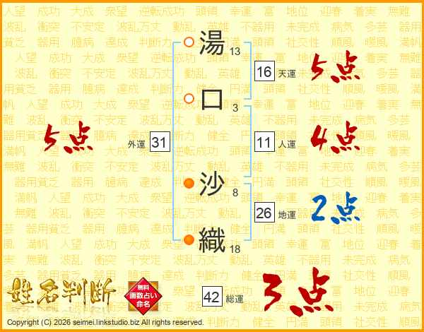 湯(13画)口(3画) 沙(8画)織(18画)