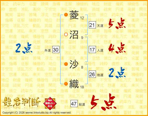 菱(12画)沼(9画) 沙(8画)織(18画)