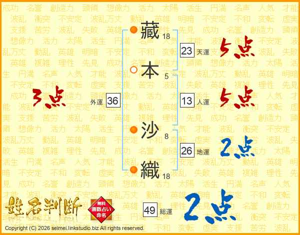 あなたの人生を表す1番重要な運勢です。生涯を通じて影響する総合運となり、主に50歳以降の晩年期に影響を及ぼします。苗字と名前の合計画数。