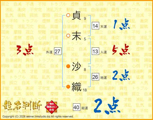 貞(9画)末(5画) 沙(8画)織(18画)