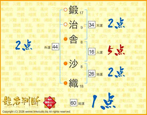 鍛(17画)治(9画)舎(8画) 沙(8画)織(18画)