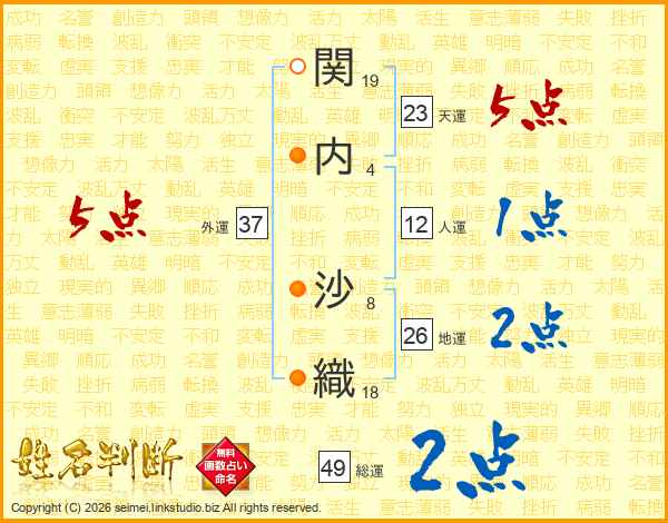 関(19画)内(4画) 沙(8画)織(18画)