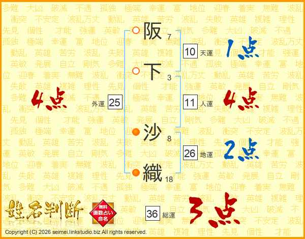 生活面を象徴する運勢です。外部から受ける影響力を表し、結婚運、家庭運や職場、環境への順応性を表します。総運から人運を引いた画数。姓や名が1文字の場合を除く。