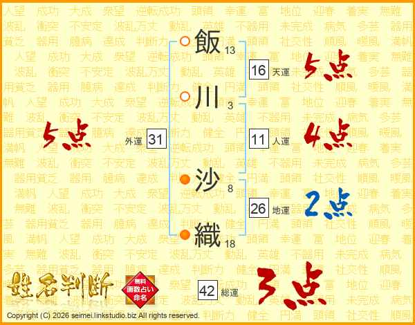 飯(13画)川(3画) 沙(8画)織(18画)