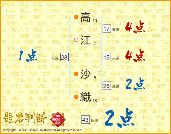 生活面を象徴する運勢です。外部から受ける影響力を表し、結婚運、家庭運や職場、環境への順応性を表します。総運から人運を引いた画数。姓や名が1文字の場合を除く。