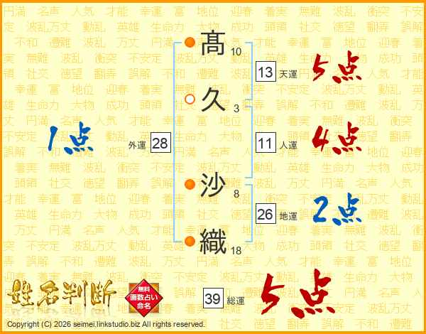 髙(10画)久(3画) 沙(8画)織(18画)