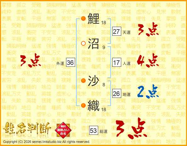 鯉(18画)沼(9画) 沙(8画)織(18画)