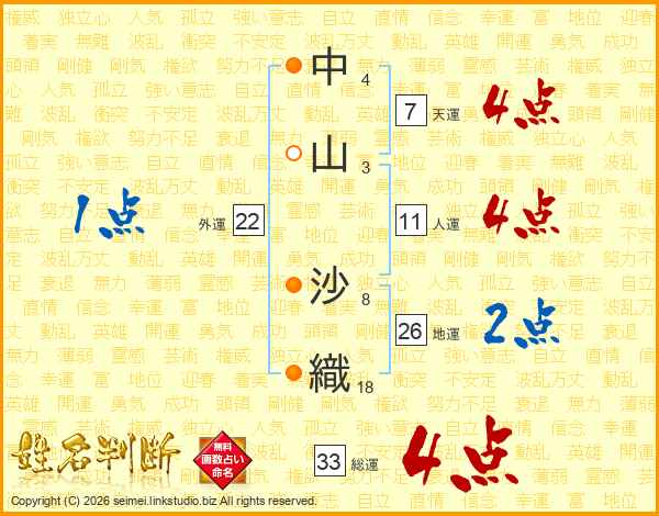 生活面を象徴する運勢です。外部から受ける影響力を表し、結婚運、家庭運や職場、環境への順応性を表します。総運から人運を引いた画数。姓や名が1文字の場合を除く。