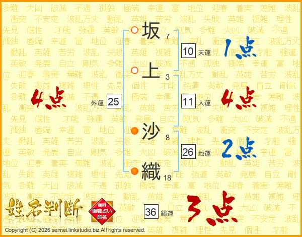 坂(7画)上(3画) 沙(8画)織(18画)