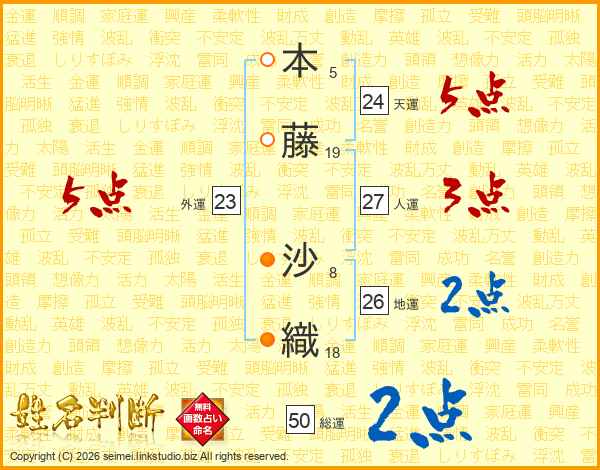 本(5画)藤(19画) 沙(8画)織(18画)