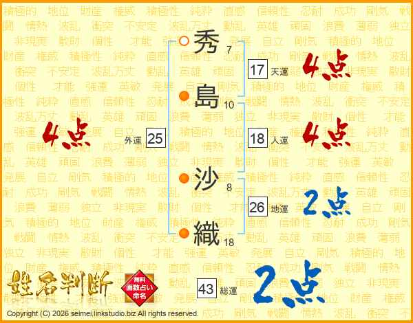 生活面を象徴する運勢です。外部から受ける影響力を表し、結婚運、家庭運や職場、環境への順応性を表します。総運から人運を引いた画数。姓や名が1文字の場合を除く。
