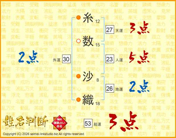 生活面を象徴する運勢です。外部から受ける影響力を表し、結婚運、家庭運や職場、環境への順応性を表します。総運から人運を引いた画数。姓や名が1文字の場合を除く。