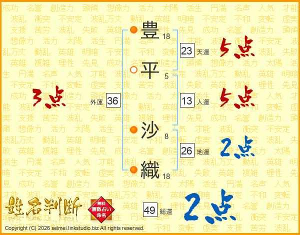 生活面を象徴する運勢です。外部から受ける影響力を表し、結婚運、家庭運や職場、環境への順応性を表します。総運から人運を引いた画数。姓や名が1文字の場合を除く。