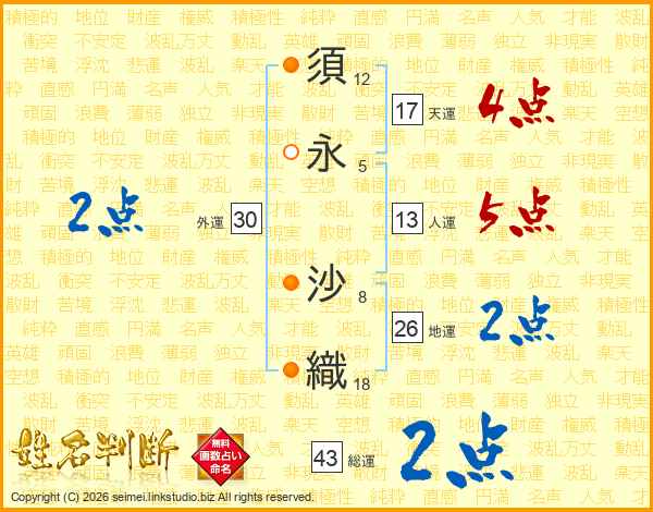 生活面を象徴する運勢です。外部から受ける影響力を表し、結婚運、家庭運や職場、環境への順応性を表します。総運から人運を引いた画数。姓や名が1文字の場合を除く。
