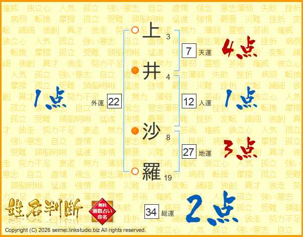 上(3画)井(4画) 沙(8画)羅(19画)