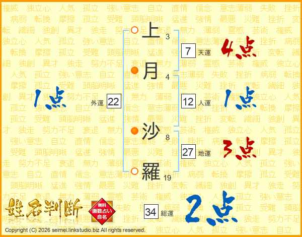 上(3画)月(4画) 沙(8画)羅(19画)