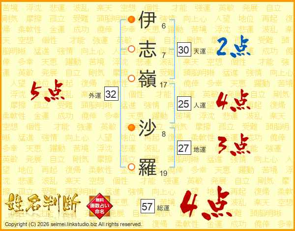伊(6画)志(7画)嶺(17画) 沙(8画)羅(19画)