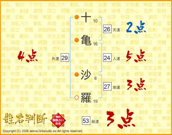 十(10画)亀(16画) 沙(8画)羅(19画)