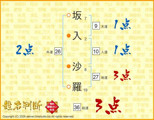 坂(7画)入(2画) 沙(8画)羅(19画)