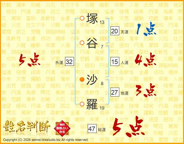 塚(13画)谷(7画) 沙(8画)羅(19画)