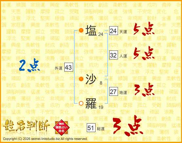 塩(24画) 沙(8画)羅(19画)