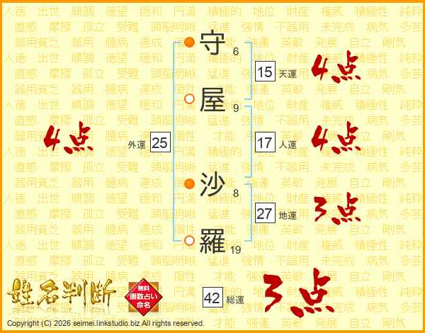 守(6画)屋(9画) 沙(8画)羅(19画)