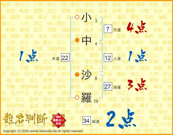 生活面を象徴する運勢です。外部から受ける影響力を表し、結婚運、家庭運や職場、環境への順応性を表します。総運から人運を引いた画数。姓や名が1文字の場合を除く。