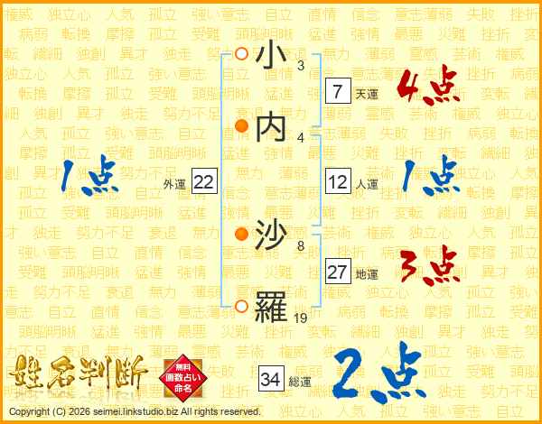 生活面を象徴する運勢です。外部から受ける影響力を表し、結婚運、家庭運や職場、環境への順応性を表します。総運から人運を引いた画数。姓や名が1文字の場合を除く。