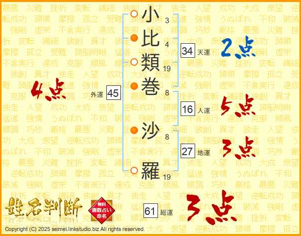 小(3画)比(4画)類(19画)巻(8画) 沙(8画)羅(19画)