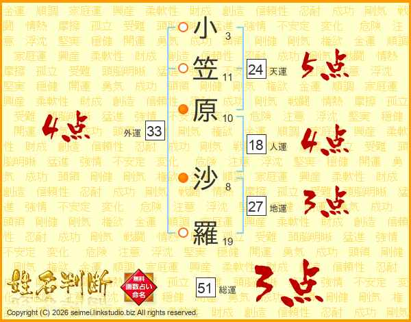 小(3画)笠(11画)原(10画) 沙(8画)羅(19画)