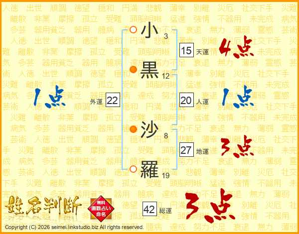 小(3画)黒(12画) 沙(8画)羅(19画)