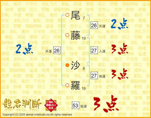 尾(7画)藤(19画) 沙(8画)羅(19画)